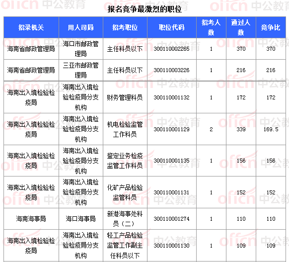 截止到5日16時(shí),競(jìng)爭(zhēng)比例的職位為海南省郵政管理局海口市郵政管理局主任科員以下一職,招錄1人,截止到5日16時(shí)通過(guò)人數(shù)為370人。