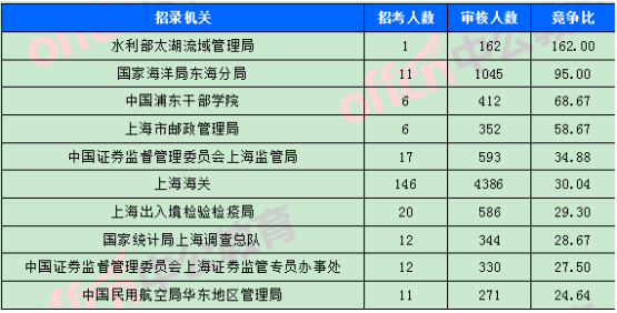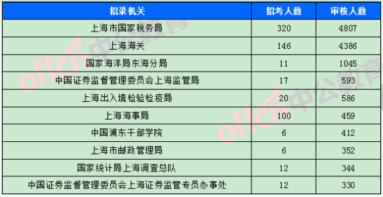 為幫助廣大考生更清晰的了解今日報名情況,中公網(wǎng)校整理了審核通過人數(shù)前十位的部門以及競爭比例最激烈的十大部門,供廣大考生參考: