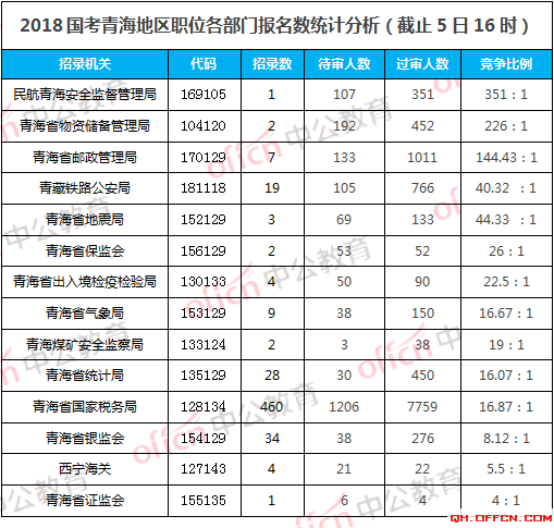 截至11月5日16時,據(jù)中公網(wǎng)校統(tǒng)計,國考職位中工作地點在青海省的職位報名人數(shù)為13605人,通過審核總?cè)藬?shù)為11554人,平均競爭比例為31.83:1。