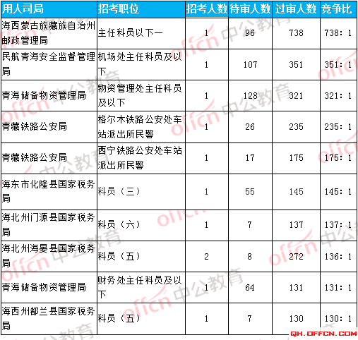 截至到5日16時,競爭比例的職位為海西蒙古族藏族自治州郵政管理局主任科員以下一職,招錄1人,截至到4日16時審核通過人數(shù)為738人,是此次國考青海地區(qū)競爭比例的一個職位!