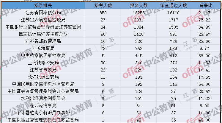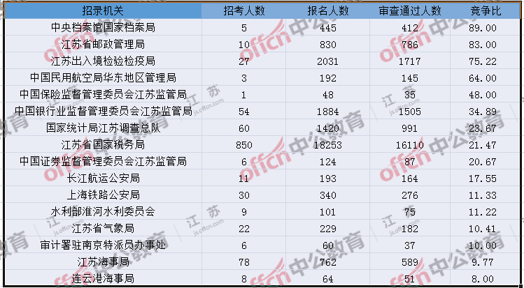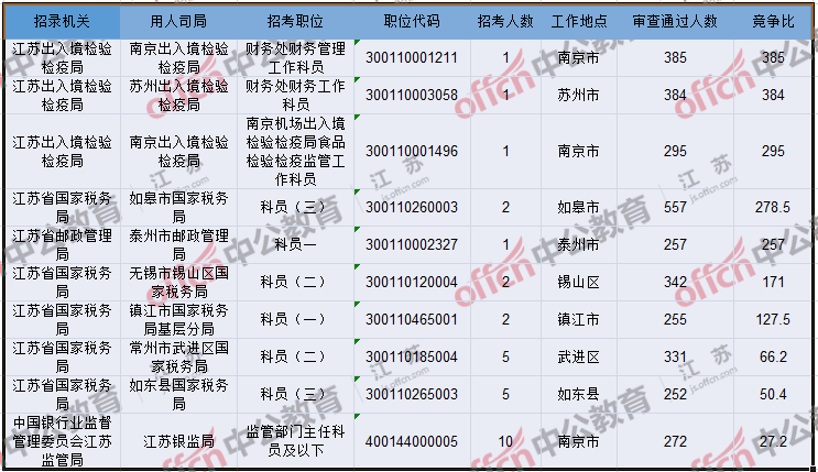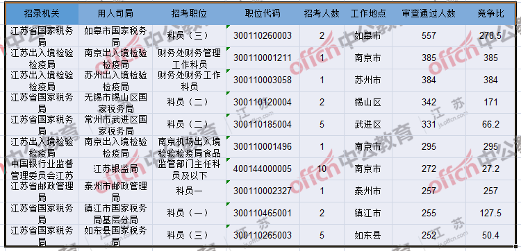 報(bào)名通過(guò)審核人數(shù)前十的職位主要集中在江蘇出入境檢驗(yàn)檢疫局、江蘇省郵政管理局、江蘇省國(guó)家稅務(wù)局等部門(mén),具體信息如下: