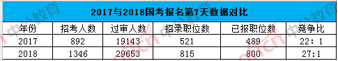 截至11月5日16時,據(jù)中公網(wǎng)校統(tǒng)計,2018國家公務(wù)員考試報名第7天,招錄職位中工作地點在湖北的職位報名總?cè)藬?shù)為41198人,通過審核29653人,比去年同期審核通過人數(shù)(19143人)增加10510人,815個職位中共有15個職位無人報考,平均競爭比例為27:1。具體信息如下: