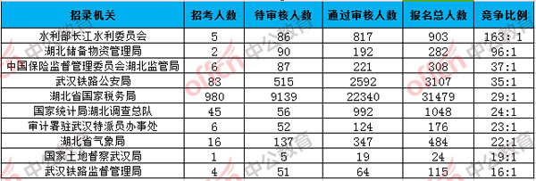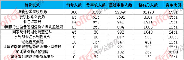 截止到11月5日16時,過審人數(shù)排名前三位的部門依次是:湖北省國家稅務(wù)局、武漢鐵路公安局、國家統(tǒng)計局湖北調(diào)查總隊,三部門通過審核總?cè)藬?shù)達(dá)25924人,占通過審核總?cè)藬?shù)的87.4%。