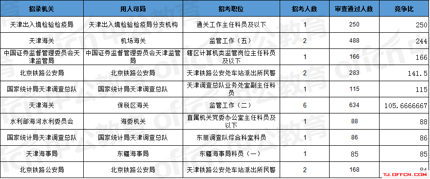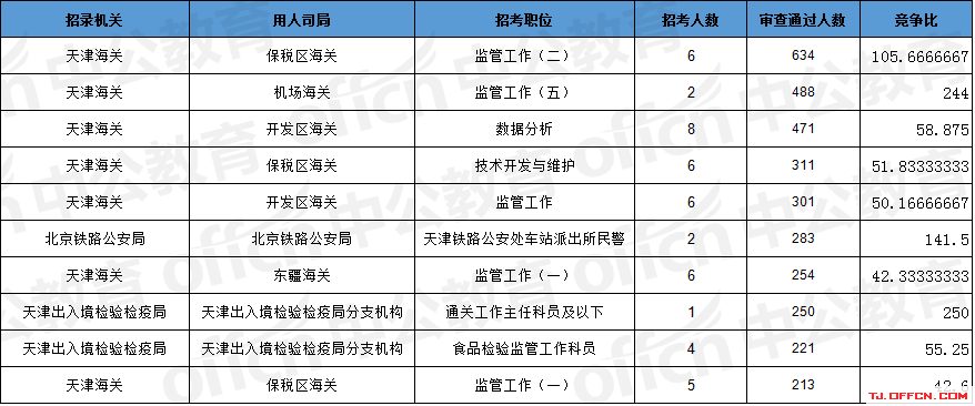 報(bào)名通過審核人數(shù)前十的職位主要集中在天津海關(guān)、北京鐵路公安局、天津出入境檢驗(yàn)檢疫局等部門,具體信息如下: