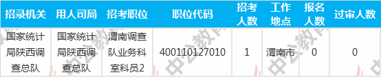 截至到6日9時(shí),工作地點(diǎn)在陜西的職位僅有1個(gè)無人報(bào)考。下面是無人報(bào)考職位一覽表,中公網(wǎng)校專家建議廣大考生多關(guān)注一些較冷職位,避免激烈競(jìng)爭(zhēng),結(jié)合自身?xiàng)l件,找到屬于自己的職位。
