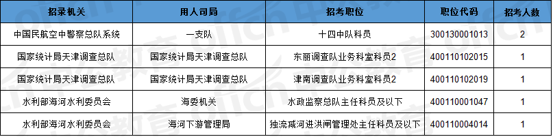 截止到6日16時(shí),工作地點(diǎn)在天津的職位共有5個(gè)無(wú)人報(bào)考,占全部職位的2.4%。下圖是無(wú)人報(bào)考職位一覽表,中公網(wǎng)校專(zhuān)家建議廣大考生多關(guān)注一些較冷職位,避免激烈競(jìng)爭(zhēng),結(jié)合自身?xiàng)l件,找到屬于自己的職位。