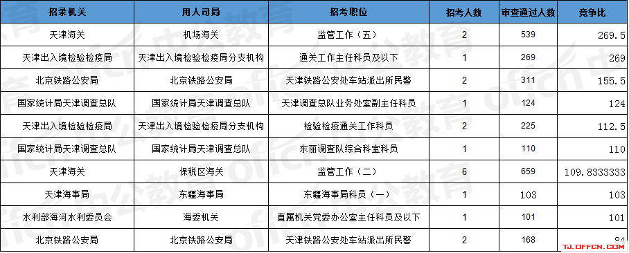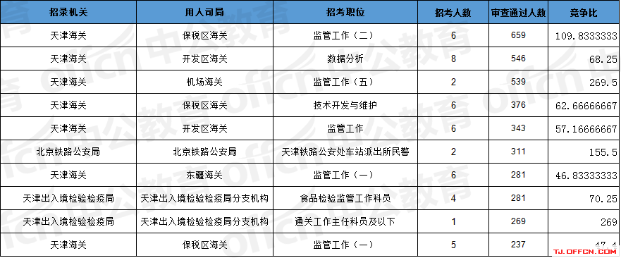 報(bào)名通過(guò)審核人數(shù)前十的職位主要集中在天津海關(guān)、北京鐵路公安局、天津出入境檢驗(yàn)檢疫局等部門(mén),具體信息如下: