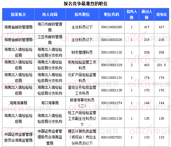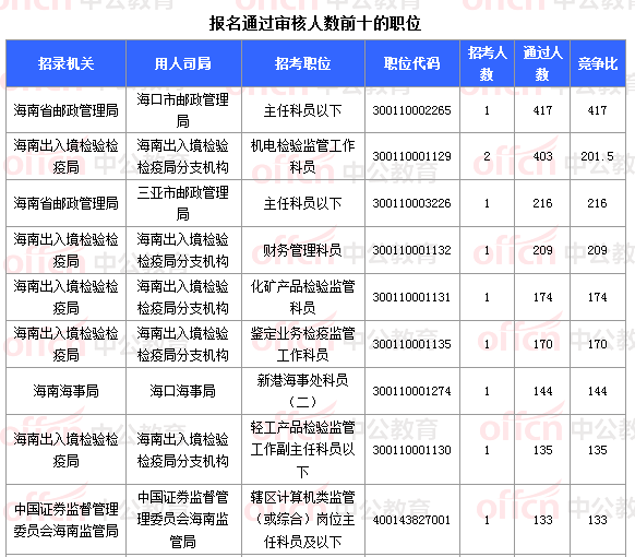 報名通過審核人數(shù)前十的職位主要集中在海南省郵政管理局、海南出入境檢驗檢疫局、海南海事局等部門,具體信息如下: