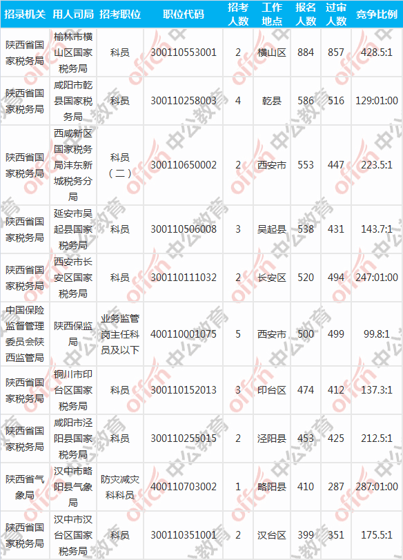 報名人數(shù)前十的職位主要集中在陜西省國家稅務(wù)局、中國保險監(jiān)督管理委員會陜西監(jiān)管局、陜西省氣象局等部門,具體信息如下: