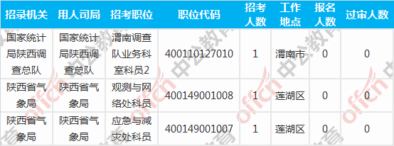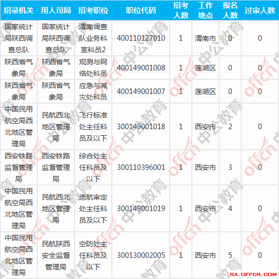 截至到6日16時,工作地點在陜西的職位共有3個無人報考,占全部職位的1%。下面是無人報考職位一覽表,中公網(wǎng)校專家建議廣大考生多關(guān)注一些較冷職位,避免激烈競爭,結(jié)合自身條件,找到屬于自己的職位。