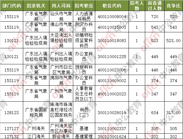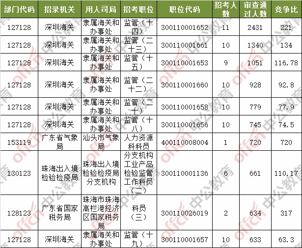 報(bào)名通過審核人數(shù)前十的職位主要集中在深圳海關(guān)、廣東省氣象局、珠海出入境檢驗(yàn)檢疫局等部門,具體信息如下: