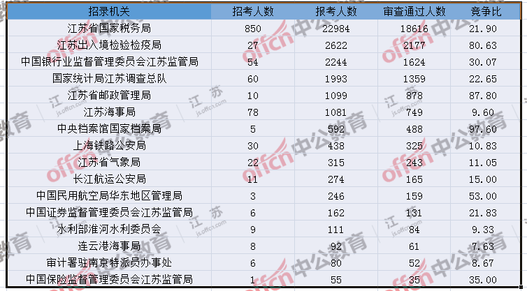 截至11月6日16時,據(jù)中公網(wǎng)校統(tǒng)計,國考職位中工作地點在江蘇的職位通過審核總?cè)藬?shù)為27146人,平均競爭比例為23:1。