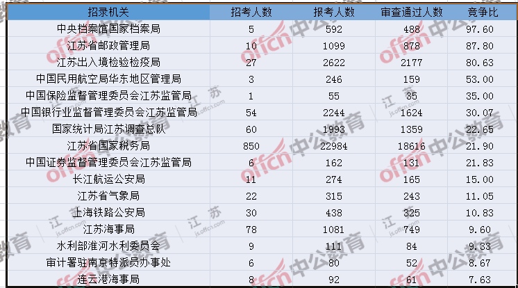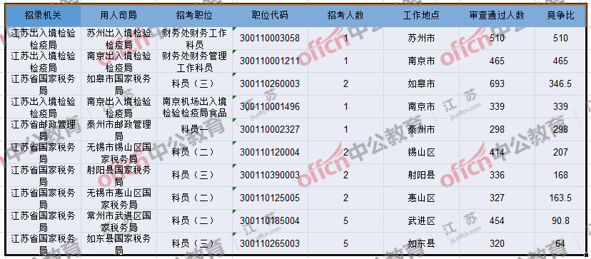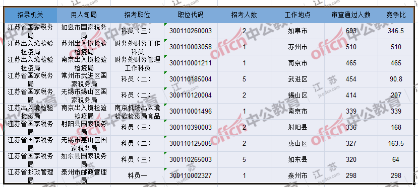 報名通過審核人數(shù)前十的職位主要集中在江蘇出入境檢驗檢疫局、江蘇省郵政管理局、江蘇省國家稅務(wù)局等部門,具體信息如下: