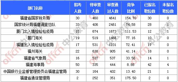 截至11月6日16時,據(jù)中公網(wǎng)校統(tǒng)計,國考職位中工作地點在福建的職位4785人待審 ,14773人通過審核,共報名19558人,其中有8個職位無人報名,平均競爭比例為61.98:1。