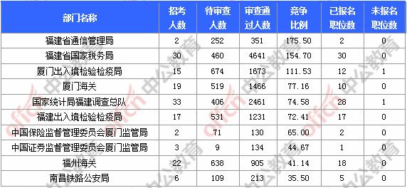 截止到6日16時,通過審核人數(shù)前三位的部門依次是:福建省國家稅務(wù)局、國家統(tǒng)計局福建調(diào)查總隊、廈門出入境檢驗檢疫局,三部門通過審核總?cè)藬?shù)達8775人,占通過審核總?cè)藬?shù)的59.39%。