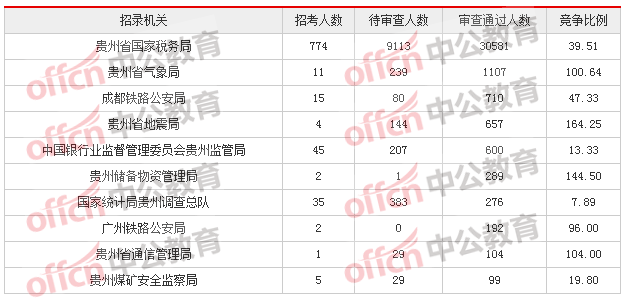 截止到5日16時,報名人數及通過審核人數前三位的部門依次是:貴州省國家稅務局、貴州省氣象局、中國銀行業(yè)監(jiān)督管理委員會貴州監(jiān)管局,三部門報名人數達到41847人,占總報名人數的92.69%,通過審核總人數達32288人,占通過審核總人數的92.68%。