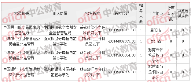 截止到6日16時(shí),工作地點(diǎn)在貴州的職位僅有4個(gè)無(wú)人報(bào)考,占全部職位的1.04%。下面是無(wú)人報(bào)考職位一覽表,中公網(wǎng)校專家建議廣大考生多關(guān)注一些較冷職位,避免激烈競(jìng)爭(zhēng),結(jié)合自身?xiàng)l件,找到屬于自己的職位。