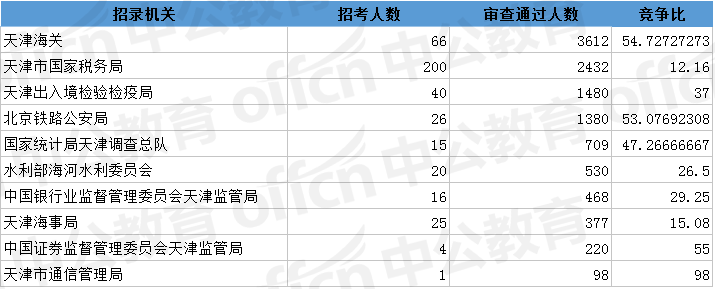 為幫助廣大考生更清晰的了解今日報名情況,中公網(wǎng)校整理了審核通過人數(shù)前十位的部門以及競爭比例最激烈的十大部門,供廣大考生參考: