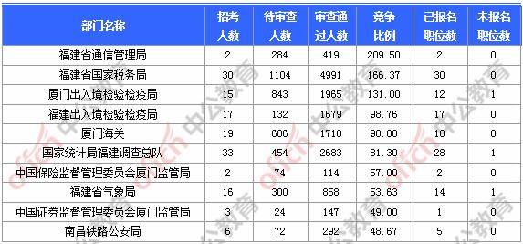 報名通過審核人數(shù)前十的職位主要集中在福建省國家稅務(wù)局、廈門出入境檢驗檢疫局、廈門海關(guān),具體信息如下: