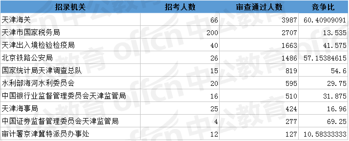 為幫助廣大考生更清晰的了解今日報名情況,中公網(wǎng)校整理了審核通過人數(shù)前十位的部門以及競爭比例最激烈的十大部門,供廣大考生參考:
