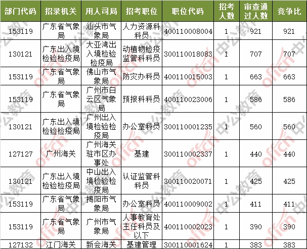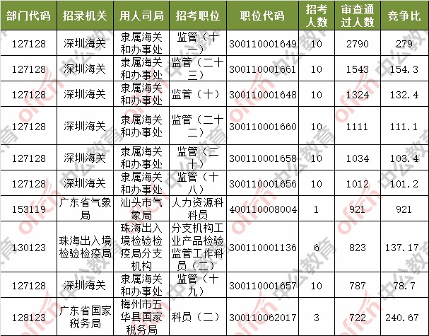 報名通過審核人數(shù)前十的職位主要集中在深圳海關、廣東省氣象局、珠海出入境檢驗檢疫局等部門,具體信息如下:
