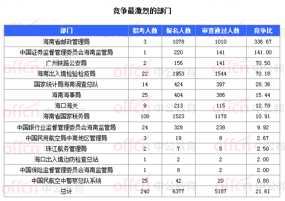 為幫助廣大考生更清晰的了解今日報名情況,中公網(wǎng)校整理了審核通過人數(shù)的部門以及競爭比例最激烈的部門,供廣大考生參考: