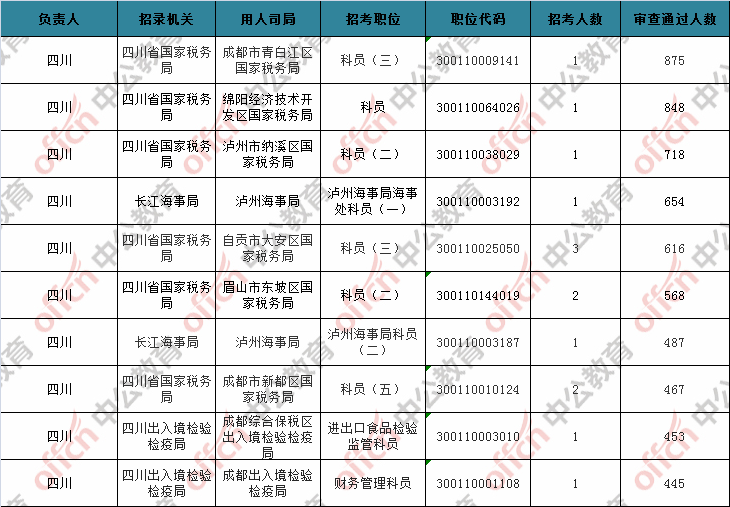 第五日?qǐng)?bào)名通過(guò)審核人數(shù)前十的職位主要集四川省國(guó)家稅務(wù)局等部門,具體信息如下: