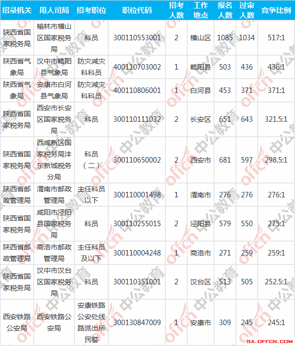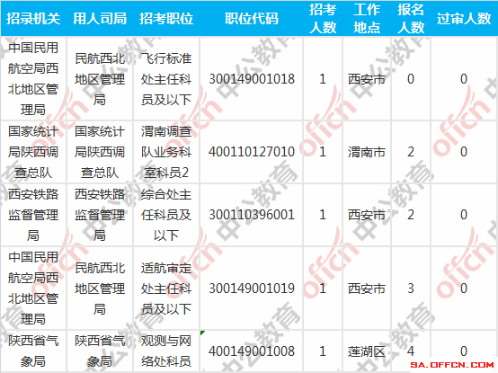 截至到7日16時(shí),工作地點(diǎn)在陜西的,過(guò)審人數(shù)為0的職位共有5個(gè)。下面是過(guò)審人數(shù)為0 的報(bào)考職位一覽表,中公網(wǎng)校專(zhuān)家建議廣大考生再仔細(xì)看看職位表,千萬(wàn)不要錯(cuò)過(guò)了報(bào)名的時(shí)期。