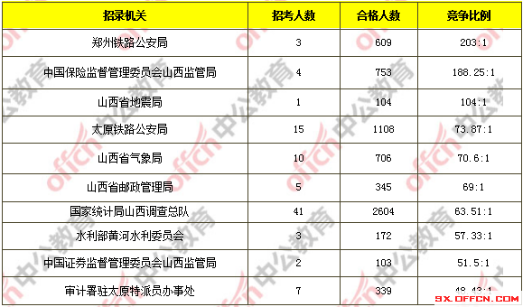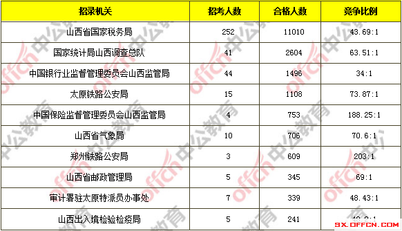 截至11月7日16時,據(jù)中公網(wǎng)校統(tǒng)計,國考職位中工作地點在山西的職位通過審核總?cè)藬?shù)為19695人,和昨天相比增加了4841人,與去年同期相比合格人數(shù)減少了3241人,截止目前共有8個職位無人報考,平均競爭比例為37.09:1,和去年同期競爭比增長了2.39%。