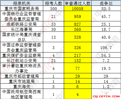 截止到7日16時(shí),通過審核人數(shù)前三位的部門依次還是:重慶市國家稅務(wù)局、中國銀行業(yè)監(jiān)督管理委員會(huì)重慶監(jiān)管局、成都鐵路公安局,三部門通過審核總?cè)藬?shù)達(dá)11844人,占通過審核總?cè)藬?shù)的86.1%。