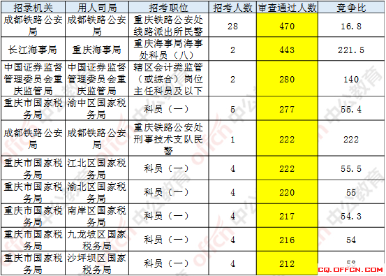 報(bào)名通過審核人數(shù)前十的職位主要集中在成都鐵路公安局、長(zhǎng)江海事局、中國證券監(jiān)督管理委員會(huì)重慶監(jiān)管局、重慶市國家稅務(wù)局四個(gè)部門。報(bào)名通過人數(shù)位居第一的職位,為成都鐵路公安局重慶鐵路公安處線路派出所民警一職,經(jīng)常進(jìn)行夜間巡線任務(wù),適合男性。符合《公務(wù)員錄用體檢特殊標(biāo)準(zhǔn)(試行)》、《公安機(jī)關(guān)錄用人民警察體能測(cè)評(píng)項(xiàng)目和標(biāo)準(zhǔn)(暫行)》所要求的標(biāo)準(zhǔn)。專業(yè)要求為法律、信息、公安類相關(guān)專業(yè),需為中共黨員或共青團(tuán)員,且限應(yīng)屆高等院校畢業(yè)生,可見許多應(yīng)屆生在大學(xué)期間申請(qǐng)成為中共黨員或共青團(tuán)員,表現(xiàn)了許多應(yīng)屆生為黨為人民服務(wù)的心。報(bào)名通過人數(shù)位居第二的長(zhǎng)江海事局重慶海事局重慶海事局海事處科員(八)一職,是前幾天占競(jìng)爭(zhēng)比例鰲頭的職位,該職位對(duì)基層工作最低年限為3年,主要招考為已步入社會(huì)工作的人員,對(duì)學(xué)位、政治面貌、服務(wù)基層項(xiàng)目工作經(jīng)歷無限制。錄用后兼任海巡艇船員,簽訂5年期服務(wù)協(xié)議,服從調(diào)配,由此看來,具有吃苦精神的大有人在。