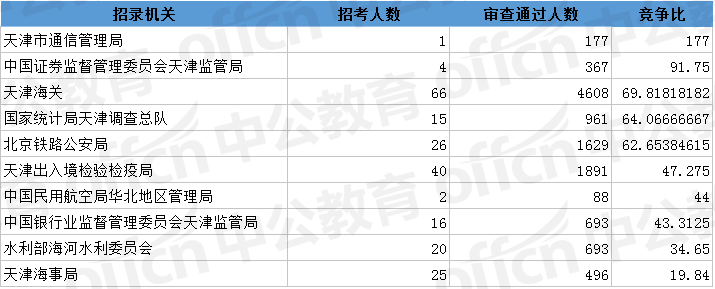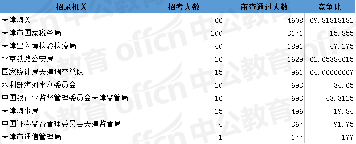為幫助廣大考生更清晰的了解今日報名情況,中公網(wǎng)校整理了審核通過人數(shù)前十位的部門以及競爭比例最激烈的十大部門,供廣大考生參考: