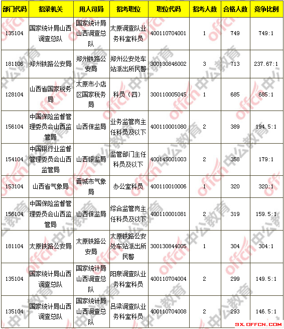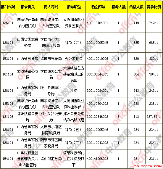 報(bào)名通過(guò)審核人數(shù)前十的職位主要集中在國(guó)家統(tǒng)計(jì)局山西調(diào)查總隊(duì)、鄭州鐵路公安局、山西省國(guó)家稅務(wù)局等部門,具體信息如下:
