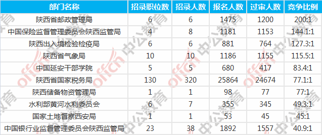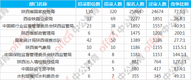 陜西國考報名競爭最激烈的十大部門