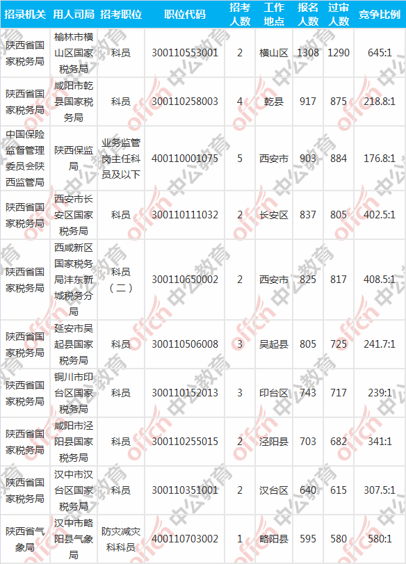 報名人數(shù)前十的職位主要集中在陜西省國家稅務局、中國保險監(jiān)督管理委員會陜西監(jiān)管局、陜西省氣象局等部門,具體信息如下: