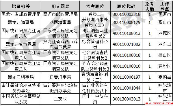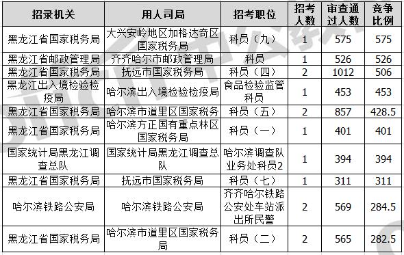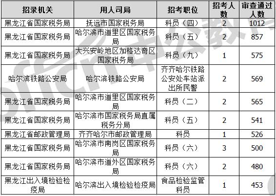 報(bào)名通過(guò)審核人數(shù)前十的職位主要集中在黑龍江省國(guó)家稅務(wù)局、哈爾濱鐵路公安局、黑龍江省郵政管理局等部門,具體信息如下: