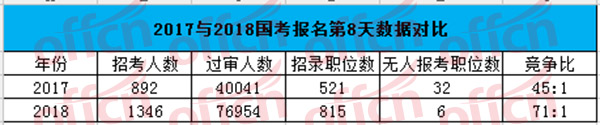 截至11月8日16時,據(jù)中公網(wǎng)校統(tǒng)計,2018國家公務(wù)員考試報名第8天,招錄職位中工作地點在湖北的職位報名總?cè)藬?shù)為89915人,通過審核76954人,比去年同期審核通過人數(shù)(40041人)增加36913人,815個職位中共有6個職位無人報考,平均競爭比例為71:1。具體信息如下: