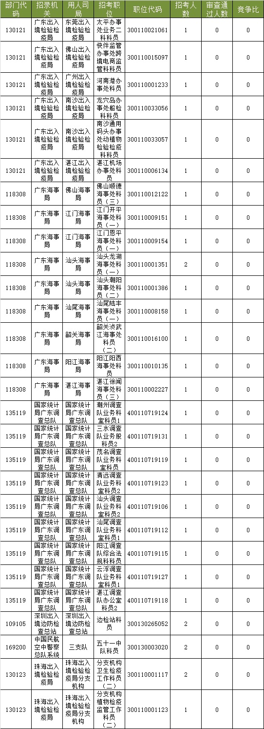 截止到8日16時,工作地點在廣東的職位共有28個無人報考,占全部職位的2.12%。下面是無人報考職位一覽表,中公網校專家建議廣大考生多關注一些較冷職位,避免激烈競爭,結合自身條件,找到屬于自己的職位。