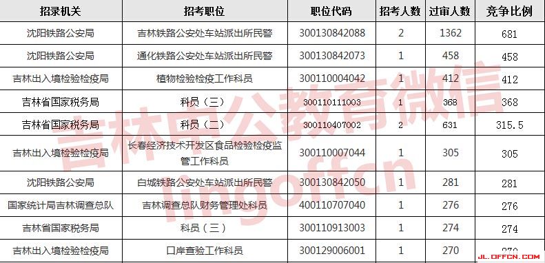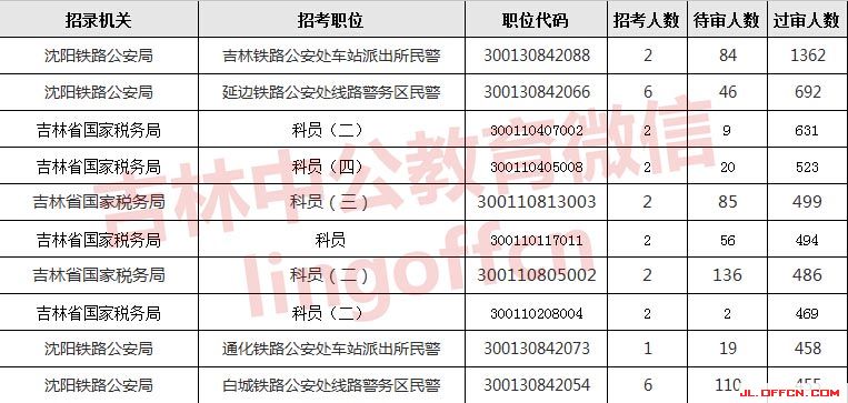報名通過審核人數(shù)前十的職位主要集中在沈陽鐵路公安局、吉林國家稅務(wù)局等部門,具體信息如下: