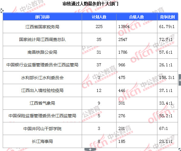 為幫助廣大考生更清晰的了解今日?qǐng)?bào)名情況,中公網(wǎng)校整理了審核通過(guò)人數(shù)前十位的部門(mén)以及競(jìng)爭(zhēng)比例最激烈的十大部門(mén),供廣大考生參考: