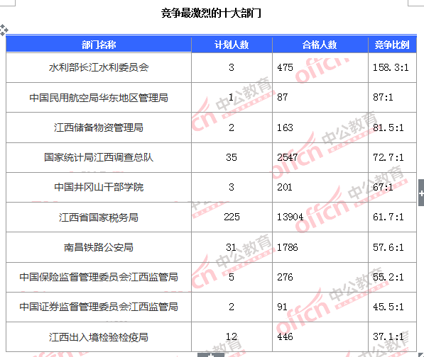 截至11月8日17:30時(shí),據(jù)中公網(wǎng)校統(tǒng)計(jì),國(guó)考職位中工作地點(diǎn)在江西的職位報(bào)名人數(shù)為25570人,通過(guò)審核總?cè)藬?shù)為21378人,平均競(jìng)爭(zhēng)比例為69:1。