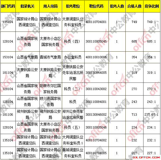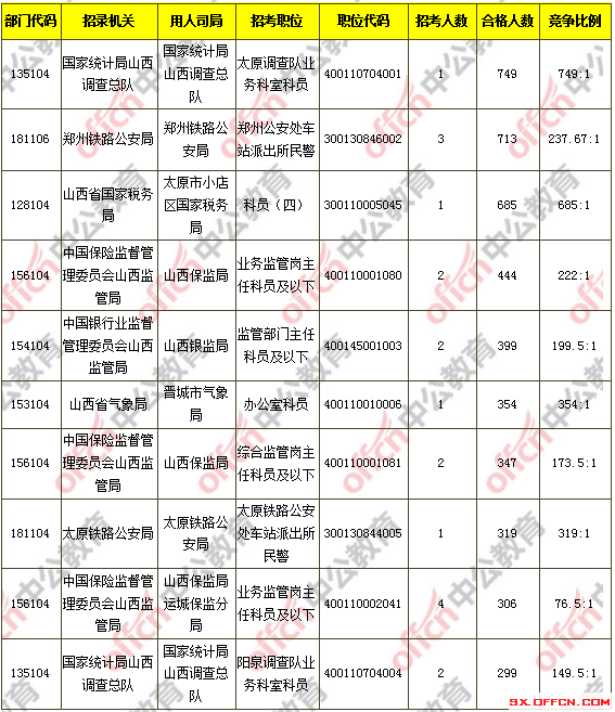 報(bào)名通過(guò)審核人數(shù)前十的職位主要集中在國(guó)家統(tǒng)計(jì)局山西調(diào)查總隊(duì)、鄭州鐵路公安局、山西省國(guó)家稅務(wù)局等部門,具體信息如下: