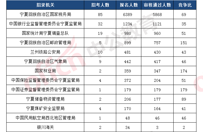 截止到11月8日17時(shí)30分,報(bào)名通過(guò)審核人數(shù)前十的職位主要為寧夏回族自治區(qū)國(guó)家稅務(wù)局、寧夏回族自治區(qū)郵政管理局,具體信息如下: