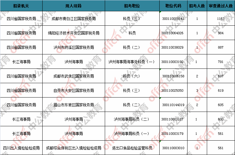 截止到8日18:00,競(jìng)爭(zhēng)比例的職位為“成都市青白江區(qū)國(guó)家稅務(wù)局科員(三)”一職,招錄1人,截止到8日18:00通過(guò)人數(shù)為1163人。中公網(wǎng)校整理了報(bào)名通過(guò)審核人數(shù)前十的職位供廣大考生參考: