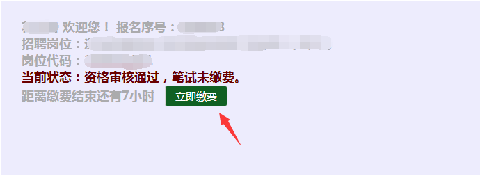 2、登錄后,如果當(dāng)前狀態(tài)提示“資格審核通過,筆試未繳費(fèi)”,可點(diǎn)擊狀態(tài)后面的“立即繳費(fèi)”按鈕進(jìn)行繳費(fèi)。