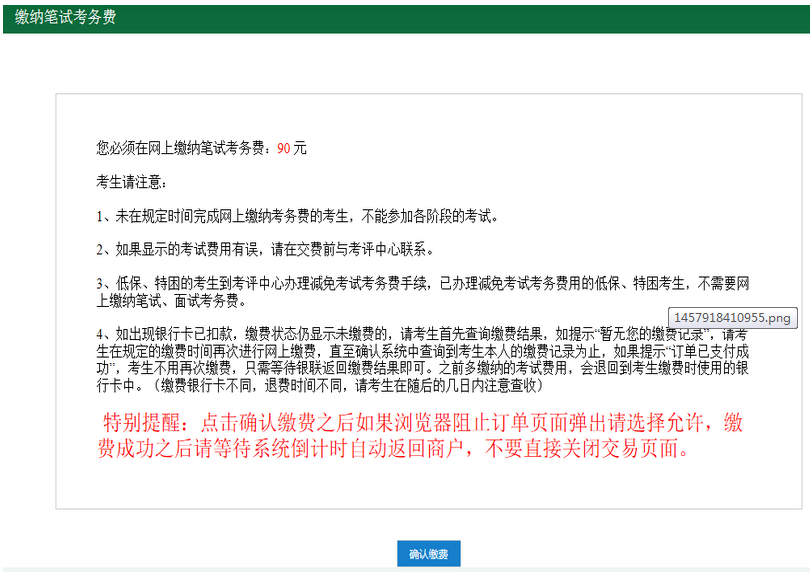 3、進(jìn)入繳納筆試考務(wù)費(fèi)頁面,請考生仔細(xì)閱讀注意事項和特別提醒。