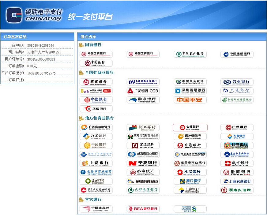 僅以天津市事業(yè)單位考試,中國銀行網(wǎng)上支付為例,演示網(wǎng)上繳費(fèi)操作流程。