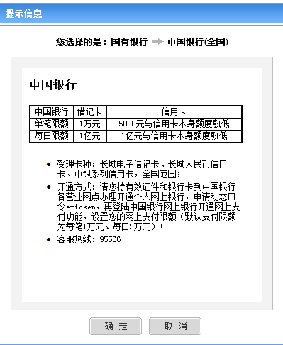 4、在銀聯(lián)頁面,點(diǎn)擊“中國銀行”(此處以中國銀行為例)。出現(xiàn)提示信息點(diǎn)擊確定。
