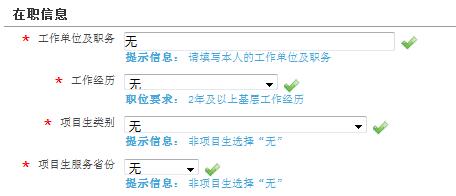 “項(xiàng)目生類別”有5個(gè)選項(xiàng),分別為“無(wú)”、“選聘高校畢業(yè)生到村任職”、“三支一扶計(jì)劃”、“大學(xué)生志愿服務(wù)西部計(jì)劃”、“農(nóng)村義務(wù)教育階段教師特設(shè)崗位計(jì)劃”;