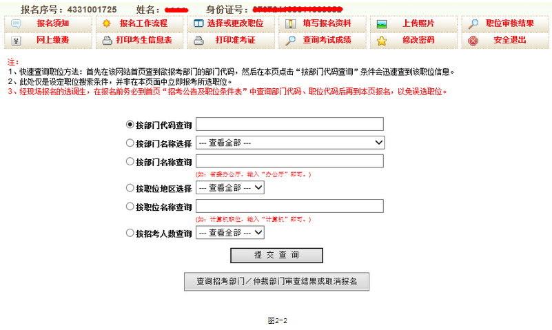 2、點擊‘選擇錄用職位’進入職位查詢界面如圖2-2,可以按照不同條件查詢招考職位的情況。